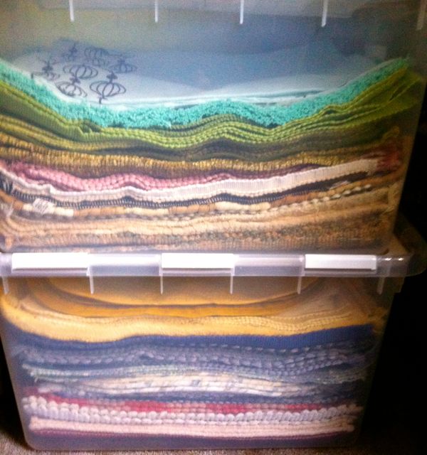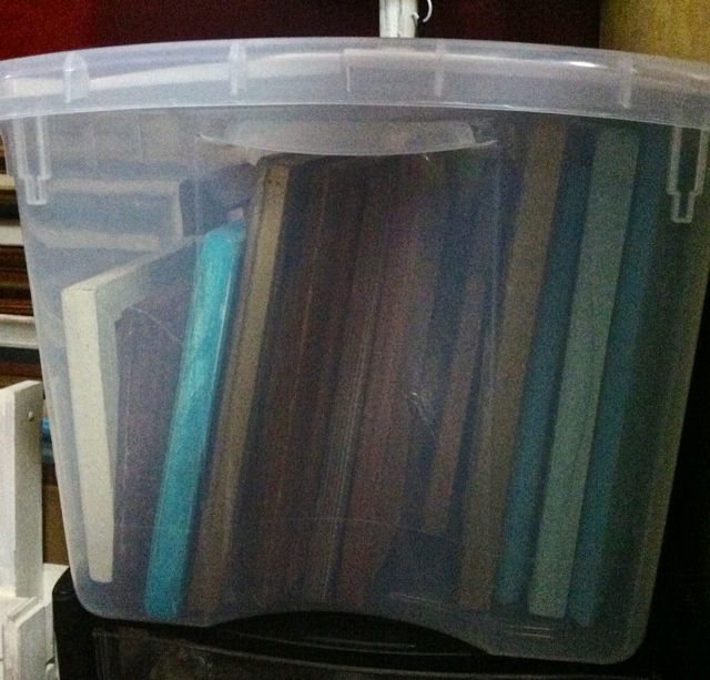 To economize, we were storing a lot of things in boxes. We labeled the boxes but it still was hard to remember what was inside, especially if it was stacked underneath another box. We decided to invest in clear containers with the lid attached. Now we can see the items through the plastic and these bins stack onto of each other neatly and safely.