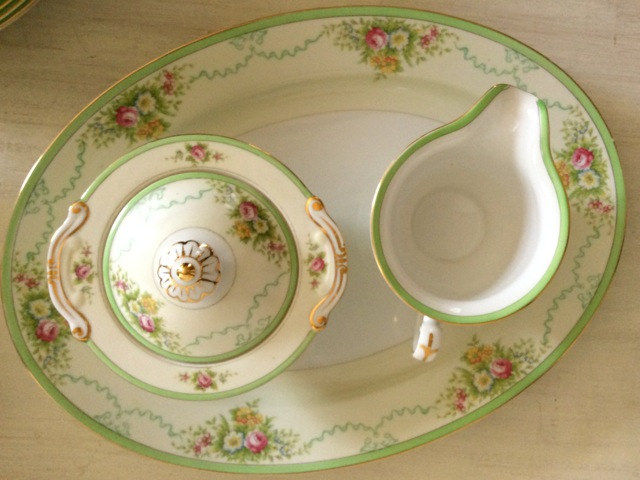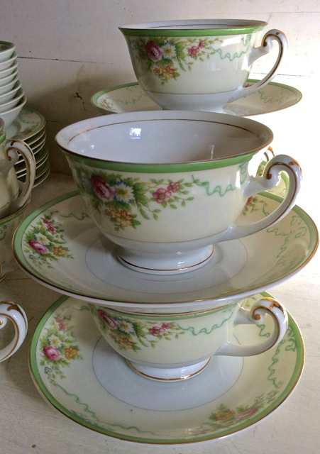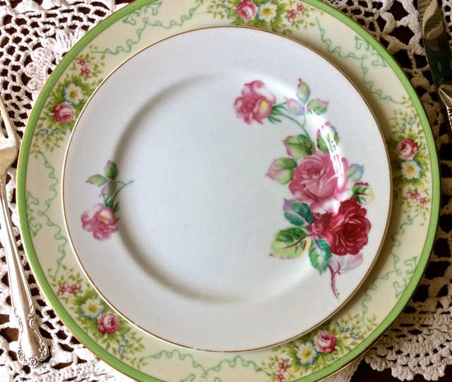 I came across another beautiful set of china that fits perfectly with the vintage china collection at Southern Vintage Table.  This vintage set belonged to Grandmother Belle and, according to her daughter in law, was used on special occasions. I can imagine how delighted Belle must have been when she set her table for her guests with her fine china! This pattern is by Grace China and called Formal Garden. Discontinued in 1939, it was made in pre-war Japan which means it’s at least 75 years old!
