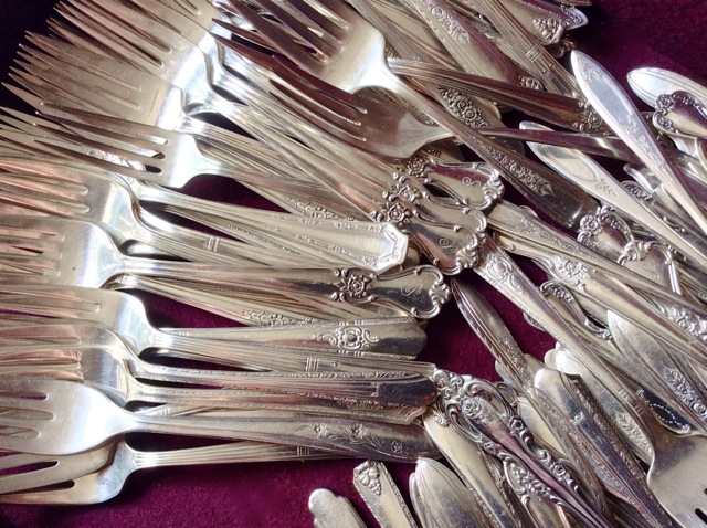 The first silver I started collecting for Southern Vintage Table was flatware. I remember finding several in a bin at the thrift store and making that decision to bring silver flatware into the inventory. I knew it would take some time to build up a collection for a large gathering. Fork by fork and spoon by spoon, we now have beautiful, gleaming collection of vintage silver flatware patterns. How delightful that each guest may personally enjoy the beauty of silver with every bite!