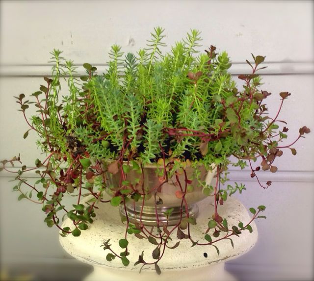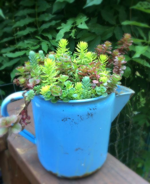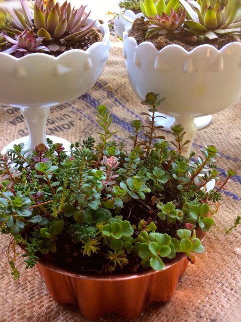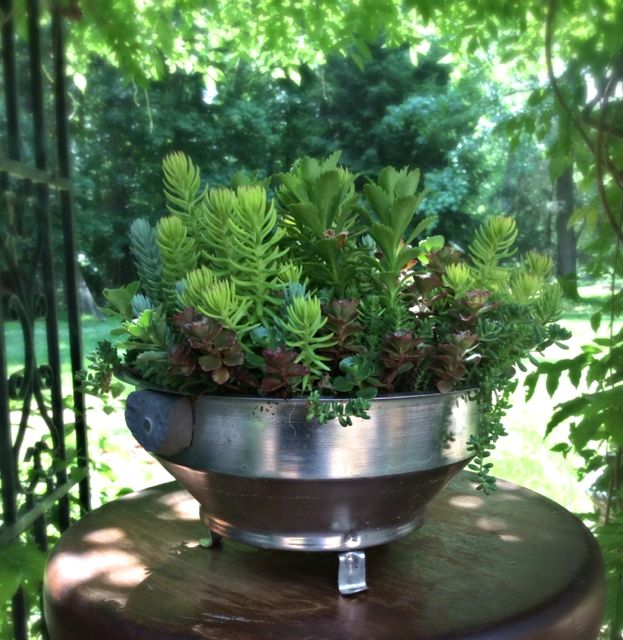 Metal dishes are even easier to convert into planters and Fernrock Farm usually has vintage copper molds available at their market stand. I found this blue metal pitcher someone had used to mix paint. The inside looks messy but who would know with a beautiful mix of sedums hiding it? The two metal bowls, one aluminum and one silver plated, also make wonderful, distinctive planters.