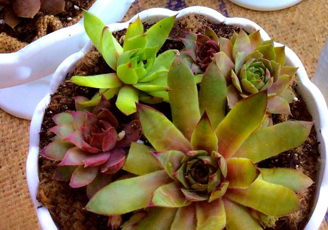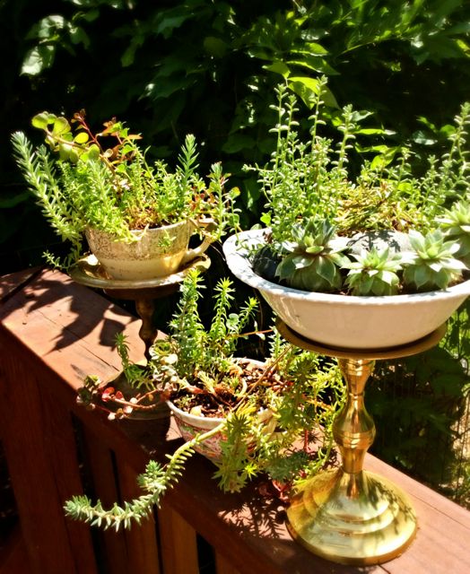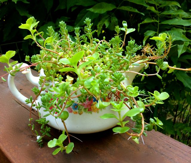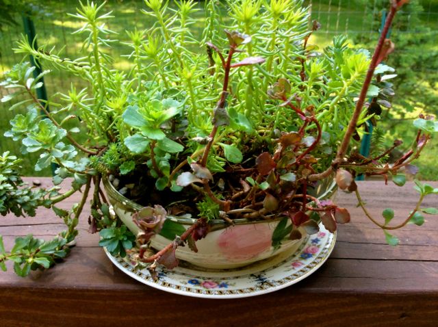 Have a chip, crack or handle broken? No worries – turn the unusual or beautiful china dish into a planter! Drill a hole in the bottom with a porcelain drill bit and it’s ready for planting. These two cups are from a vintage Franciscan pattern from the 1980s. Below is an assortment of teacups, creamers and bowls filled with sweet sedums.
