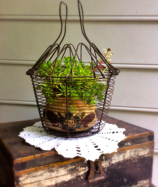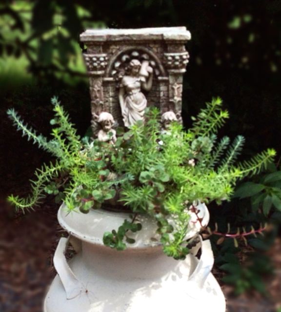 Here are two whimsical planters – a fountain and a egg basket. The pump on the fountain no longer worked so I drilled a few holes in the bottom for drainage and the basket is so quaint with a small plant tucked inside!