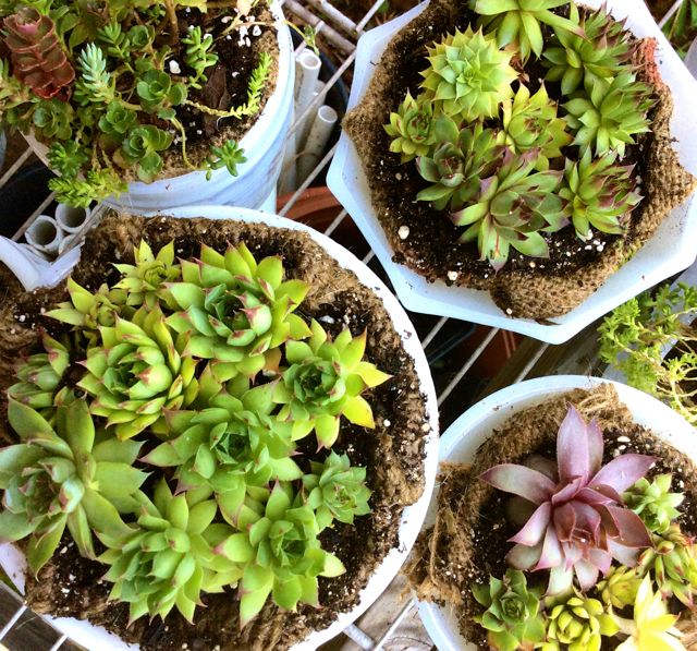 I love vintage milk glass and with hens and chicks and other sedums, the milky white color just pops! I supplied the milk glass compotes and Carrie filled them with the greenery for an upcoming wedding next month. She and Gerri made a burlap bowl so the arrangement can easily slip out of the container. They are so charming!