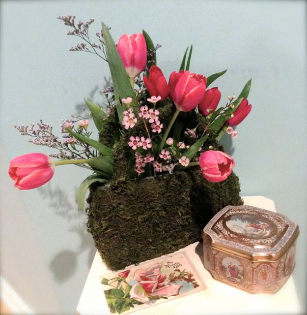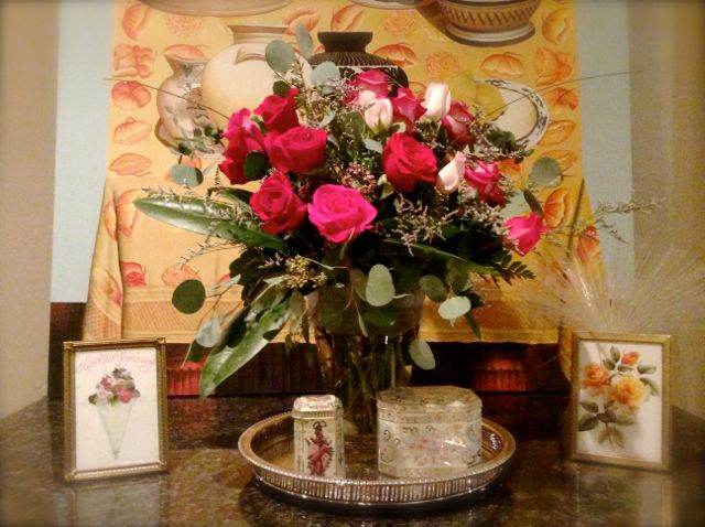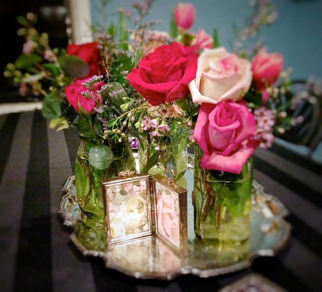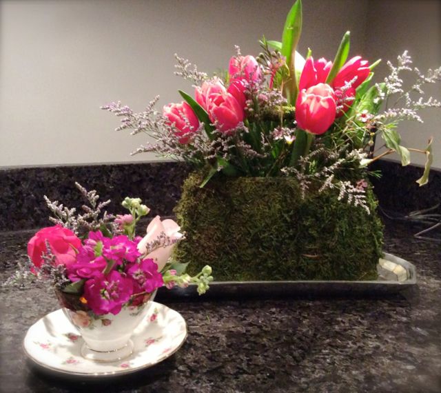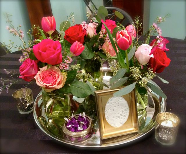 Our centerpieces began with our assortment of vintage silver-plated trays. Lush bouquets of roses and tulips along with accents of vintage frames, tins, votives, and bowls filled with chocolate kisses completed our Valentine’s look. On the coffee bar, stacked with vintage teacups, and around the room, Priscilla and I created sweet vignettes with Jami’s adorable moss-covered purse arrangements.