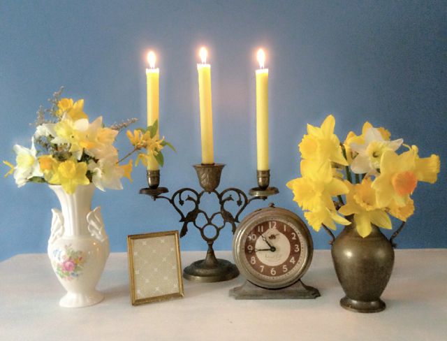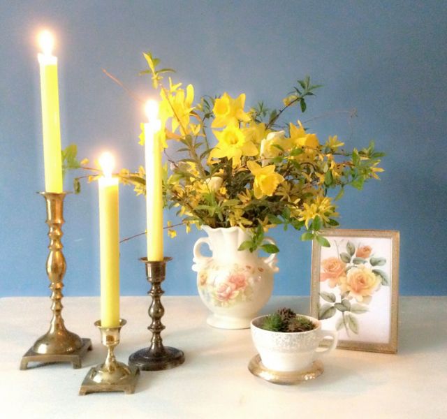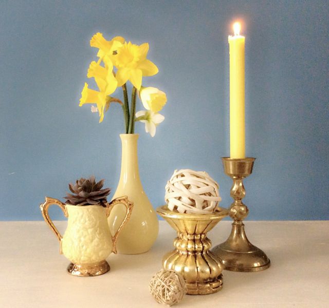 I love the color yellow – it’s warm, bright, and evokes happiness. With this joyful color of spring in mind, I gathered our vintage items of yellow and gold, picked flowers, cut sprigs, and began creating. Let’s test the steps from last week’s post with our new spring-inspired vision: