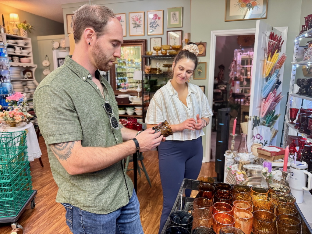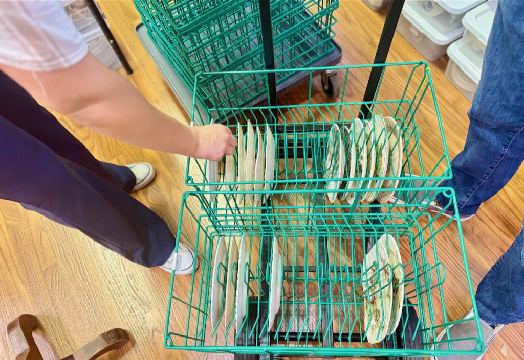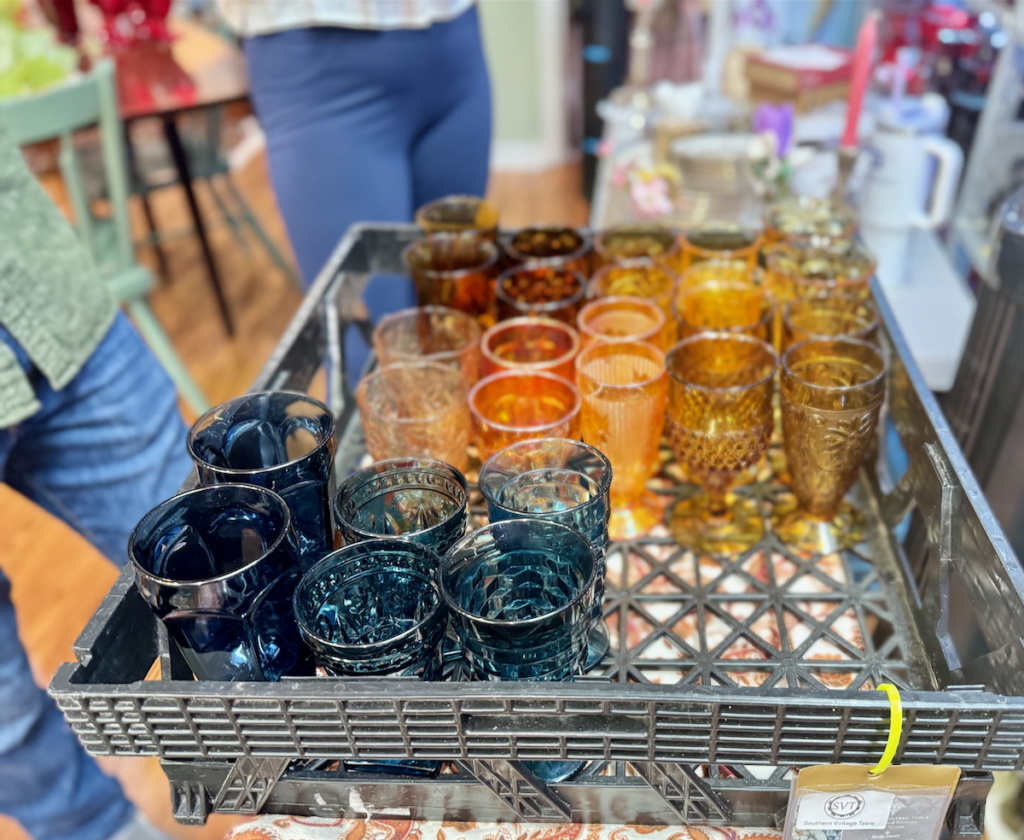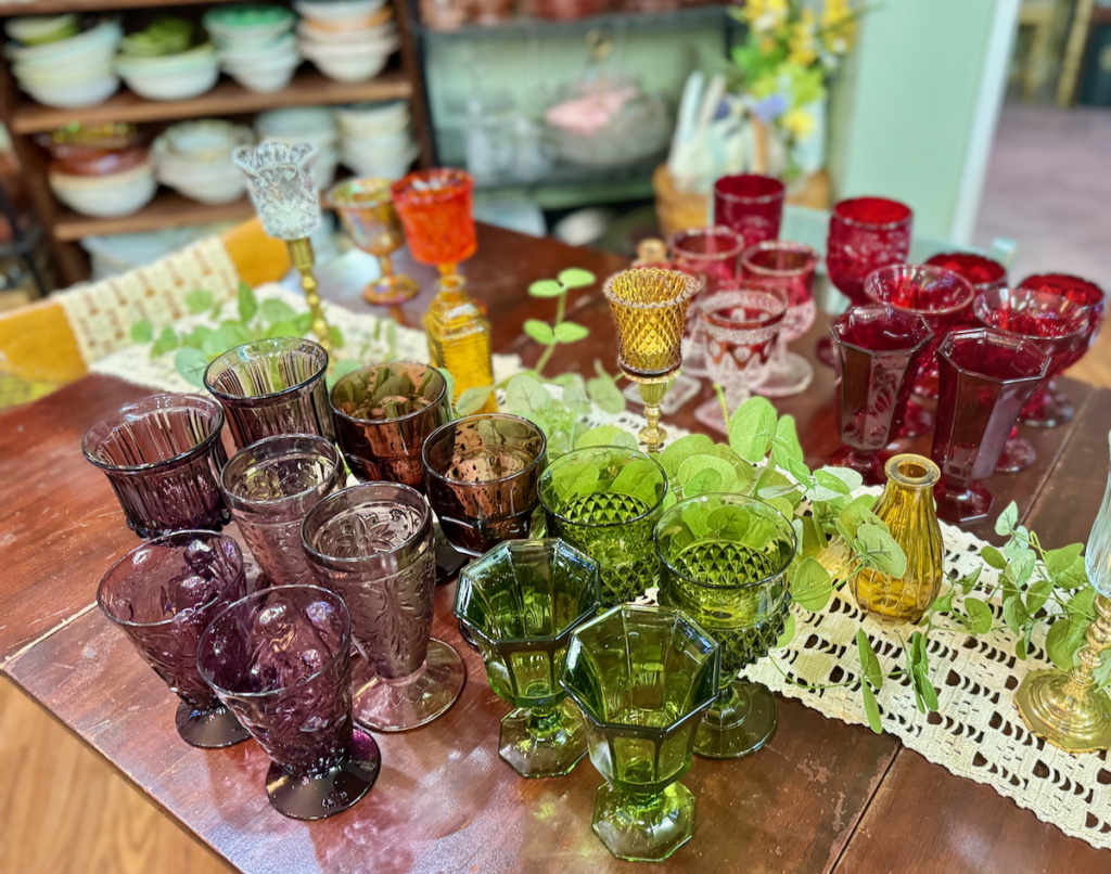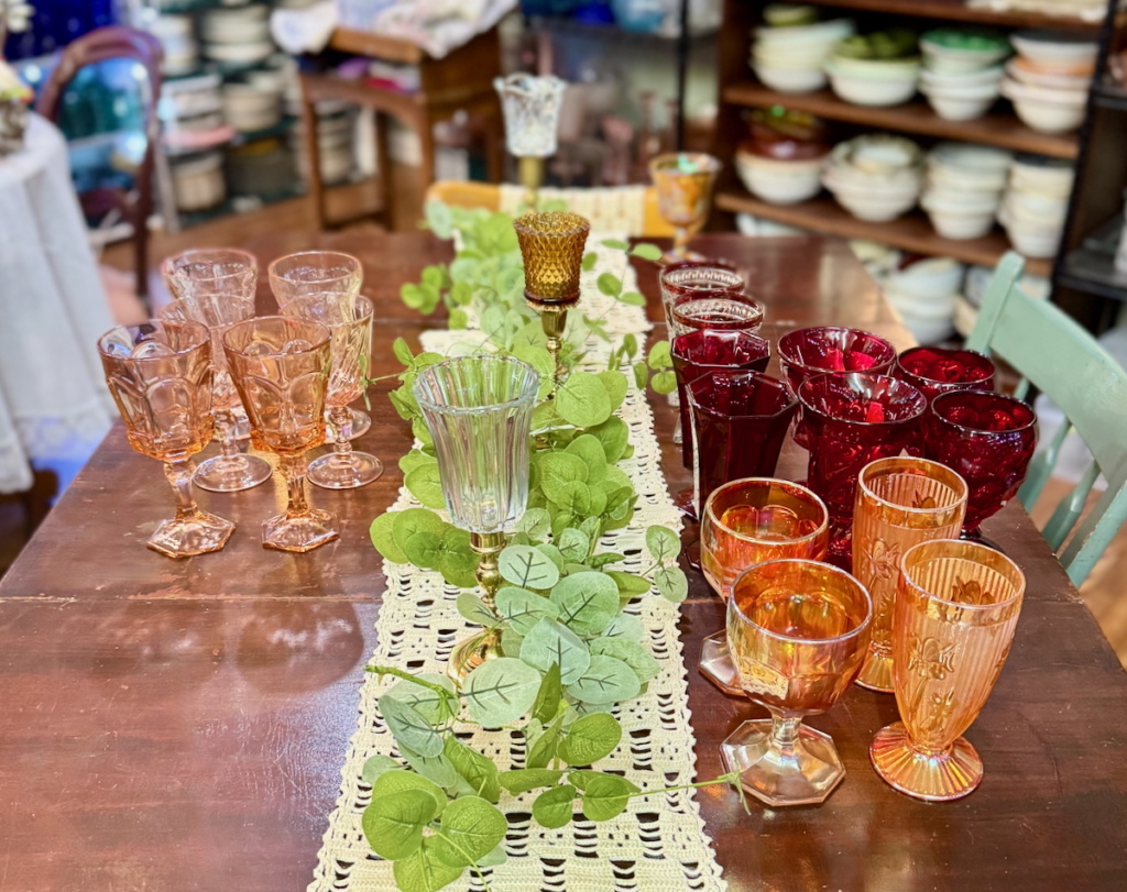 Together, they carefully designed each guest table — one by one — selecting a mix of vintage dinner plates, each with its own charming pattern. The couple thoughtfully paired their choices with an array of colored goblets, creating a distinctive look for every table. Each collection was then gently packed into crates, labeled and ready for the celebration.