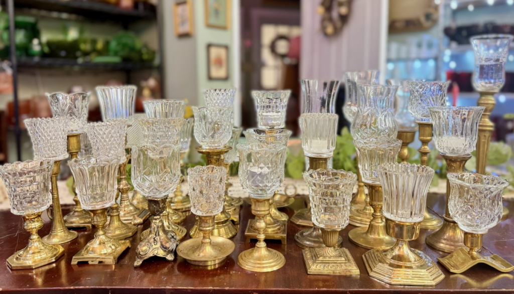 For their final touch, Olivia and Trevor chose a group of elegant candleholders paired with clear glass votives — the perfect sparkle to complement their vintage tableware.