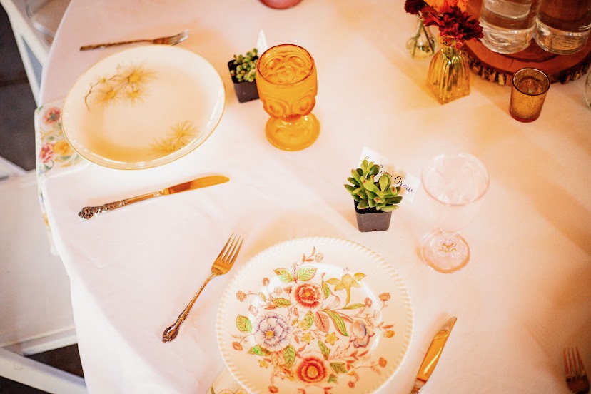 Guests enjoyed appetizers on our vintage plates before sitting down to dinner at tables that reflected the couple’s easygoing style and love of detail. Every combination felt unique, yet perfectly in tune with the cozy, autumn celebration around them.
