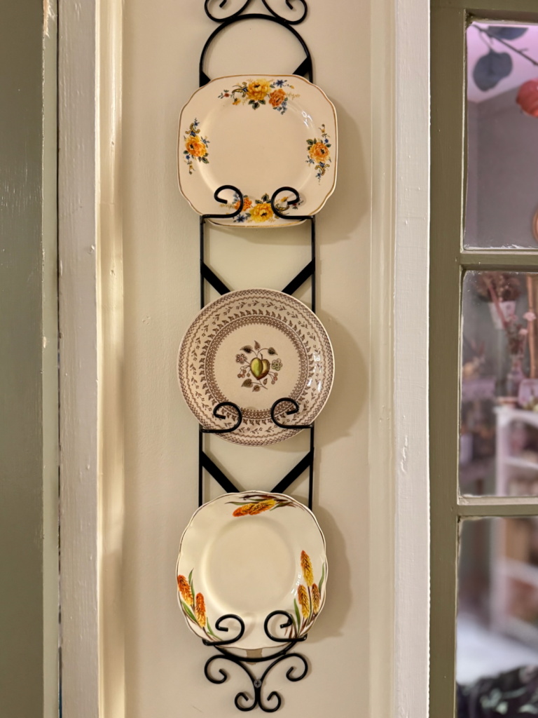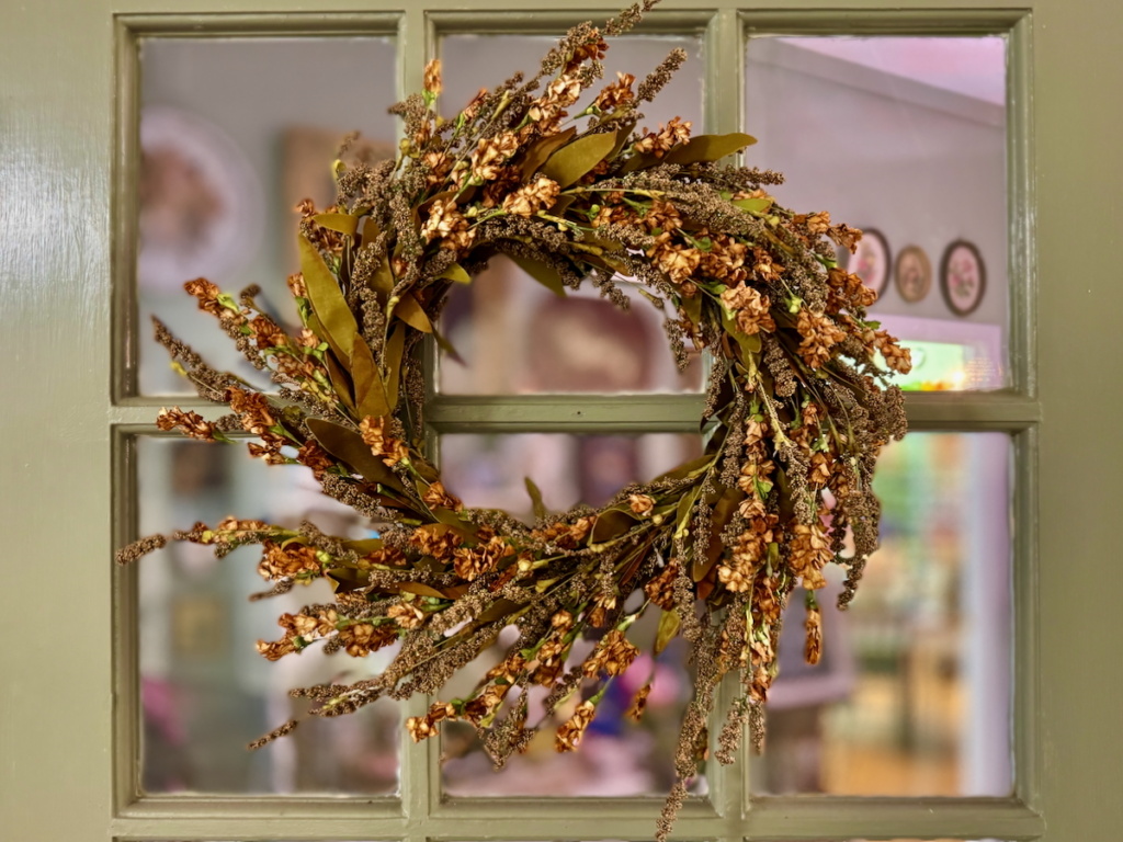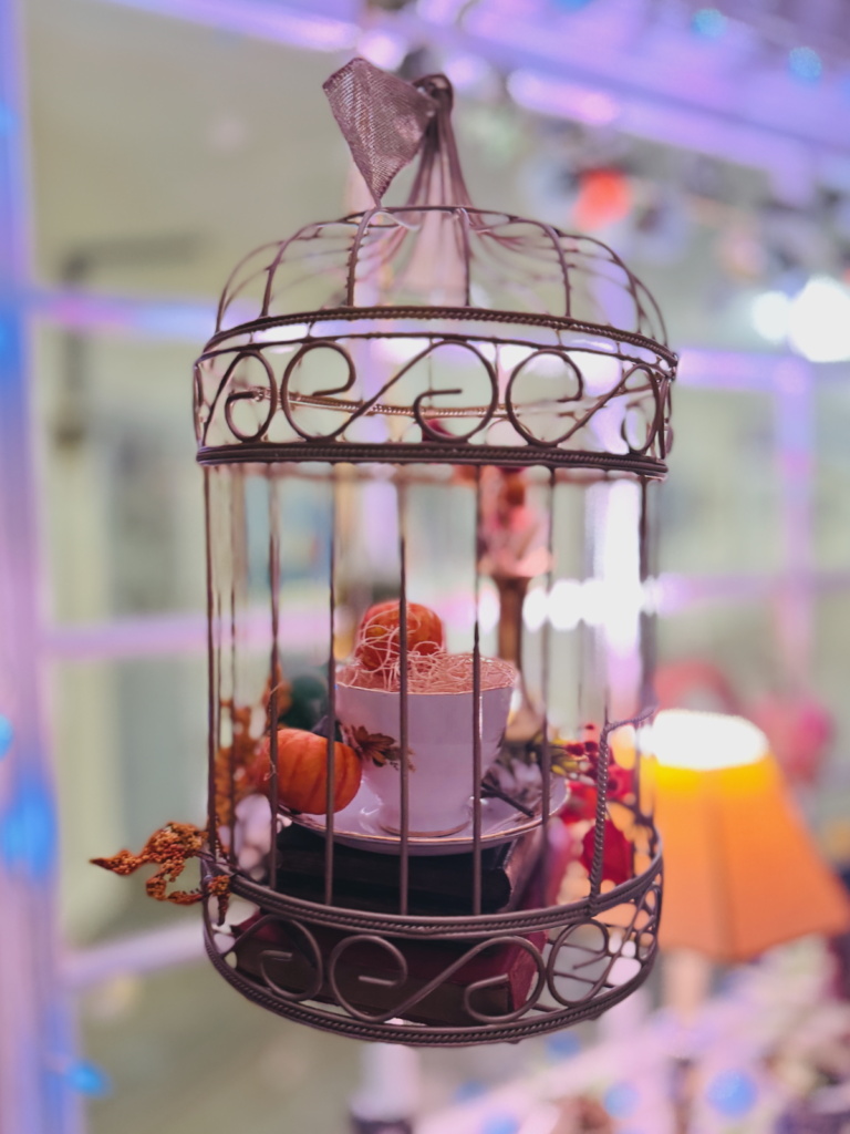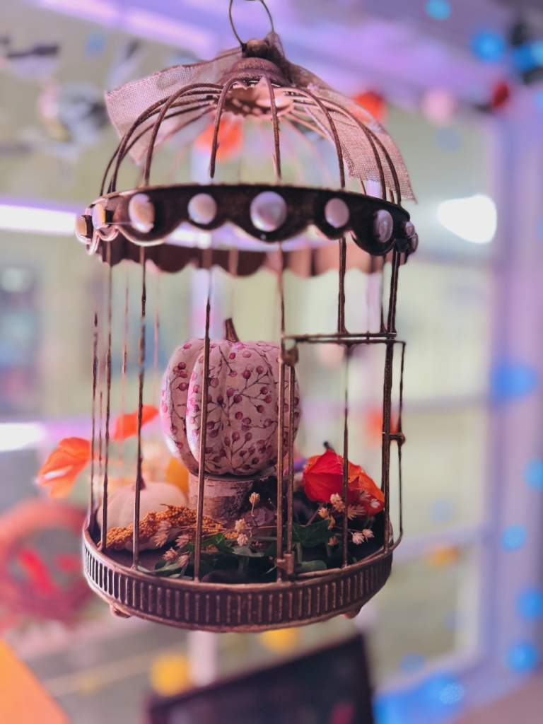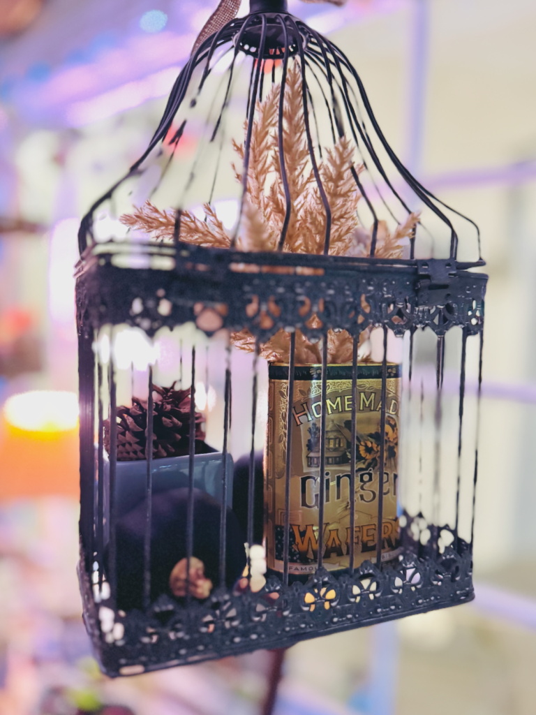 Three birdcages, each suspended with care, became charming showcases filled with autumn accents. A trio of fall-themed plates rests on a vintage plate rack, tying in our love for china with the harvest theme. To complete the look, a fall-inspired wreath welcomes guests right at the door, bursting with warm hues and textures that speak to the season.