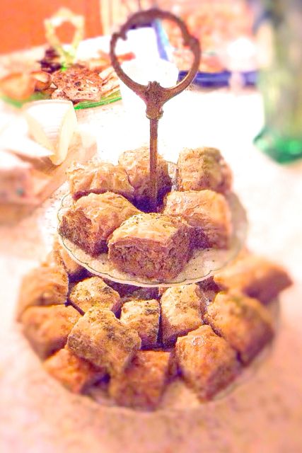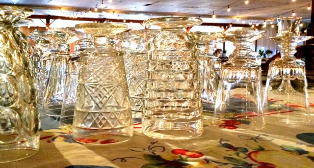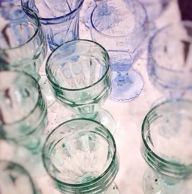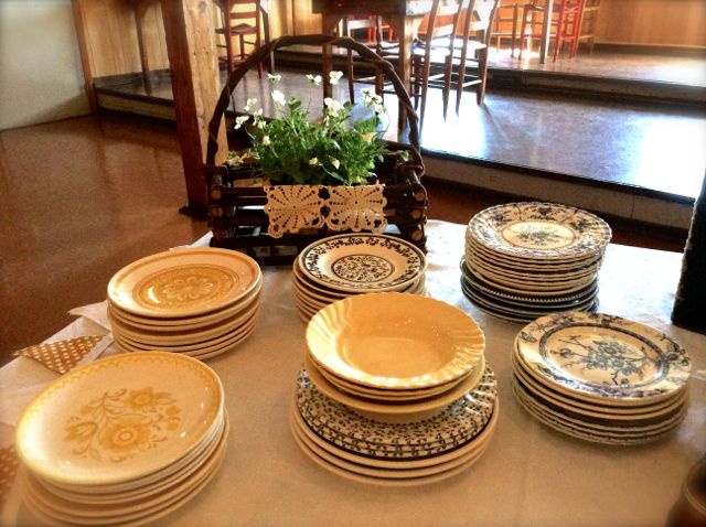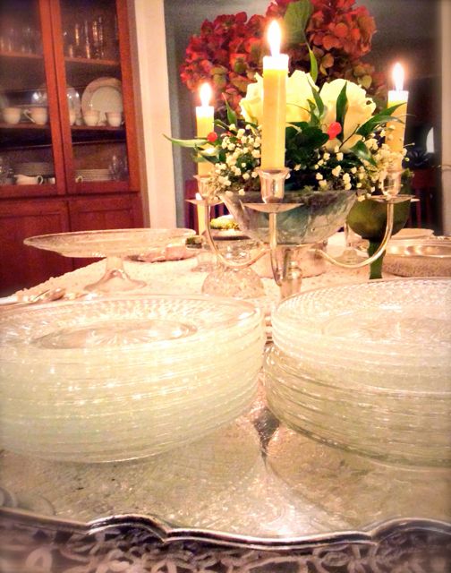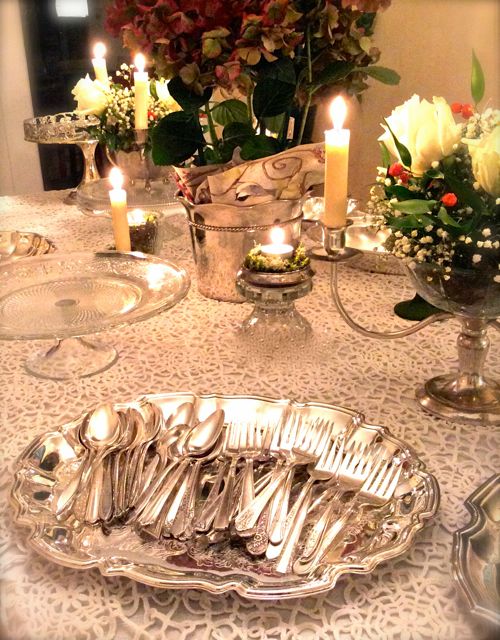 The tables were set with mixed and matched vintage china teacups with a tea napkin tucked underneath, and our lovely vintage patterns of silver-plated flatware. Vintage blue, clear, and pink goblets added the colorful sparkle. Since the delectable treats were served as a buffet, our vintage luncheon plates were beautifully stacked and ready for guests.