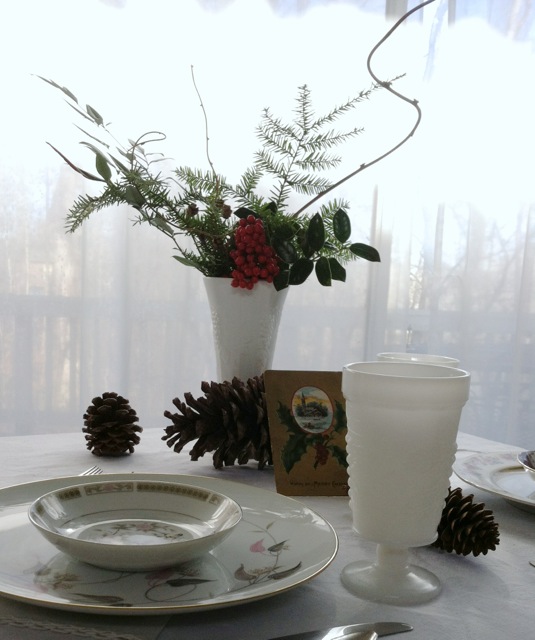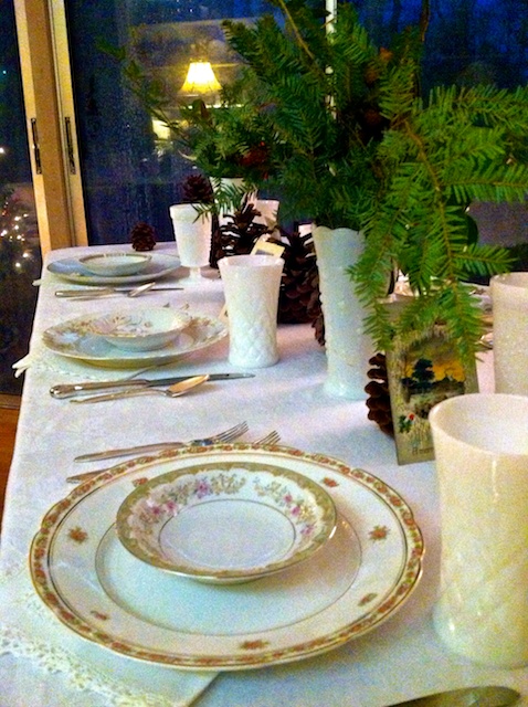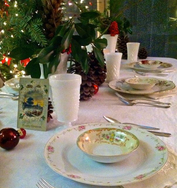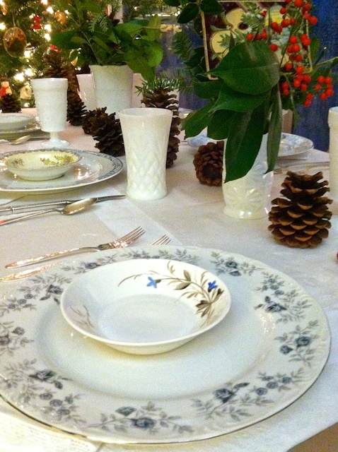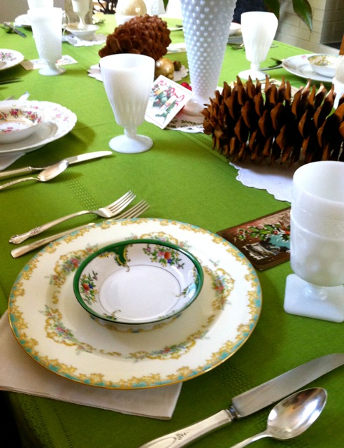 With her collection of pinecones and vintage postcards, and the vintage milk glass glassware, white linens, china and silverware from Southern Vintage Table, our table design was ready. We both knew it was going to be exceptionally special!