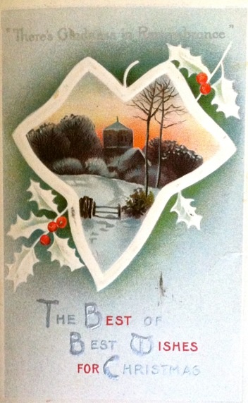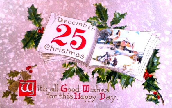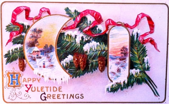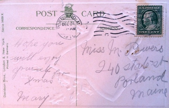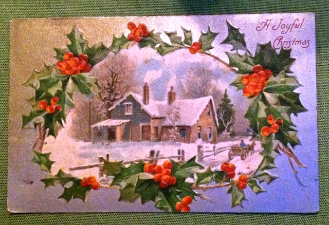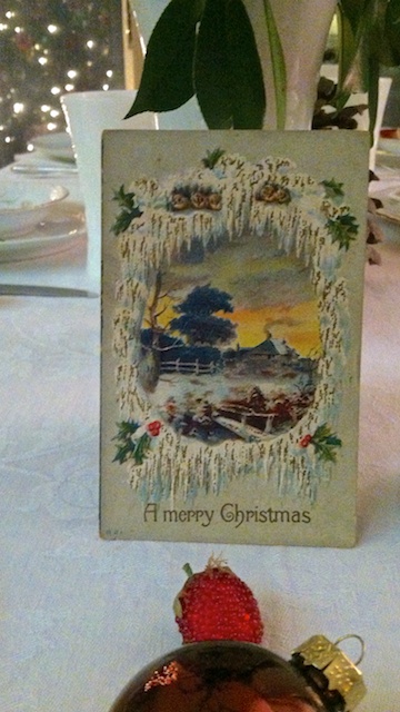 In addition to the many varieties of pinecones around her lovely home, she also has a wonderful collection of vintage Christmas postcards dating to the early 1900s. The artwork and the handwritten notes on the back portray a time we all love to imagine. Here are just a few. I included one photo of the handwritten message and address on the back – no zip code!