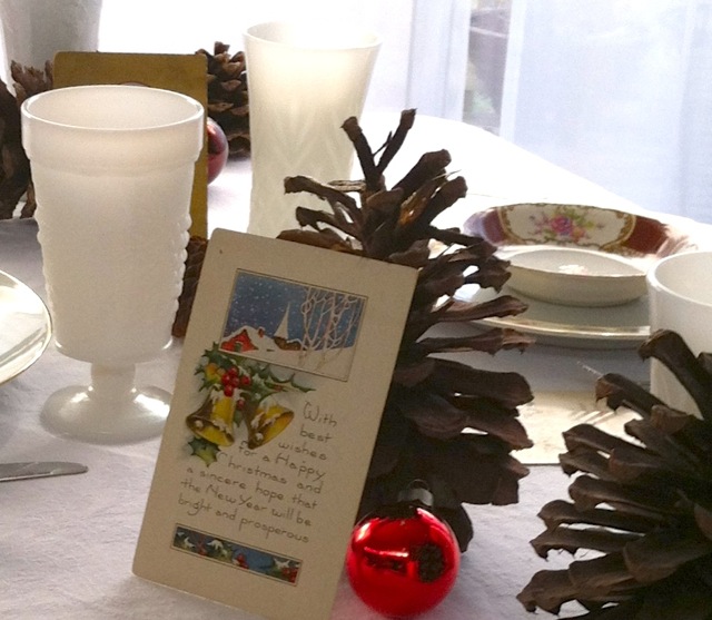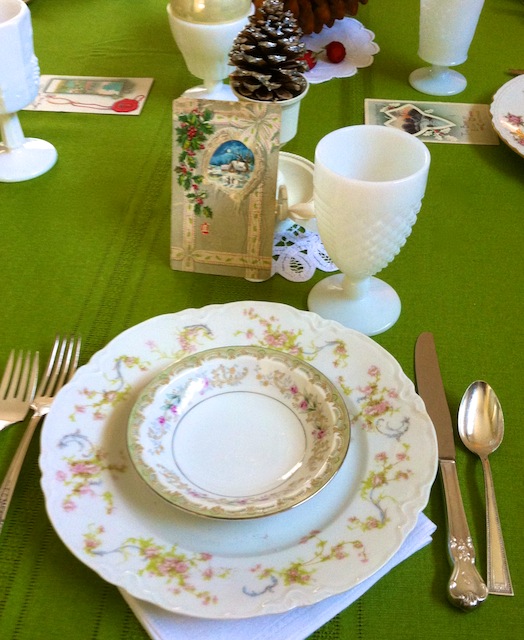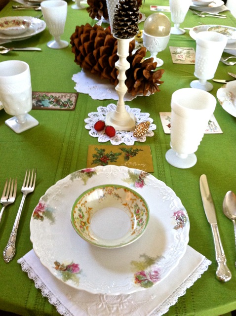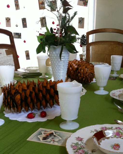 On the day before the party, the first table we set was in the dining room. We decided to use a vintage green tablecloth with vintage white doilies to accent the rich brown of the pinecones. The vintage postcards were scattered about for guests to enjoy. What a terrific touch to this vintage tablescape!