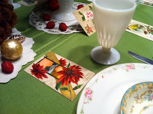 During this time I had discovered the charm of vintage postcards from my friend, Priscilla. We used them at her Christmas party and I fell in love with the look. I found a way to make a stand from vintage forks and started a collection of vintage cards. When I asked Ashley if she’d like to feature some on her table she was delighted because she also collected vintage postcards. It was a serendipitous moment!