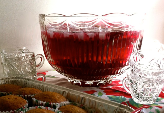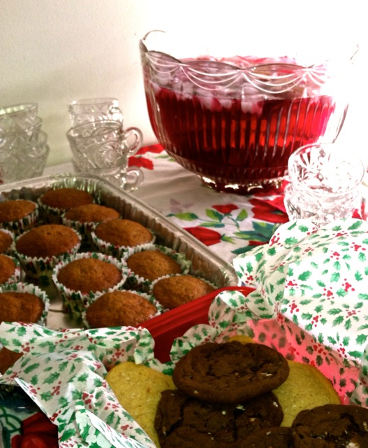 Desserts, punch and teacups were ready for guests after their delicious meal! Don’t you love the bold poinsettia pattern on the vintage tablecloths?
