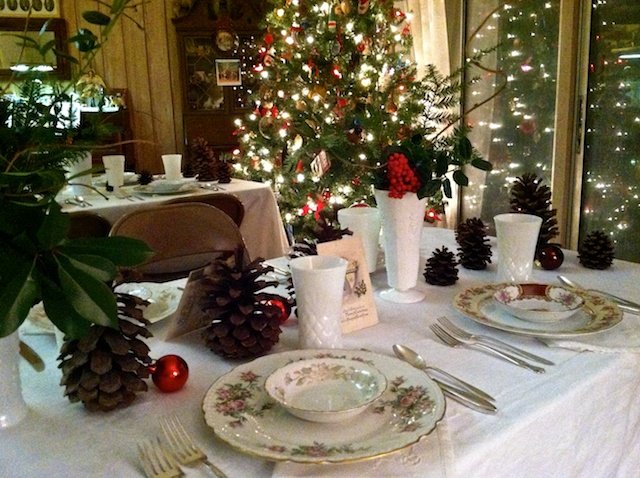 When we were planning for her party, Priscilla brought out these two incredibly huge pine cones that were at least a foot long! Of course, I wanted to know what kind they were and where they came from. Well, it turns out they are sugar tree pinecones that come from a tree that grows in California. She saw them at a science convention and thought they were amazing and wanted some for her classroom. So she wrote a letter – a time before email – to a colleague who lived in California and asked him to please send her a few sugar tree pine cones so she could share them with her students. You see, Priscilla has this way about her that when she shows you something she loves, you instantly fall in love with it, too – that’s what made her such a terrific teacher. She loved science and so did her students. Shortly after the letter was mailed, a boxful of these exquisite beauties arrived at her door and were part of her classroom for many years. Who would have known that these same pinecones would be adorning her Christmas table years later and I would be helping her set the table? As you might imagine, we shared a good laugh about it all!