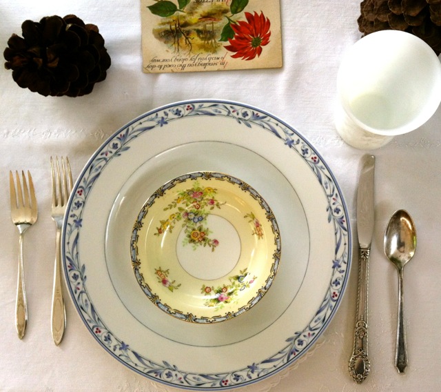 After Sarah and I shared ideas, I borrowed pieces of Grandmother Anne’s beautiful china, Phyllis by Noritake. For this important family ritual, I wanted each guest to have one piece of Anne’s china so I designed the table settings in pairs. The first pair had Anne’s dinner plate, the second had the soup bowl and the salad plate was used in the third. Using this schema, I mixed and matched the place settings down the table.