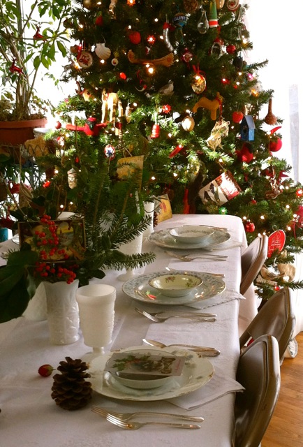 I’ve known Priscilla for well over 20 years. Our friendship began at Culbreth Middle School – she taught 6th grade science and I taught 8th grade science. We both loved to find and decorate our classrooms with all kinds of natural things – pine cones, turtle shells, skeletons, rocks, bird nests – whatever we could find or get. As kindred nature and vintage enthusiasts, our tablescape visions for her annual Christmas party were totally in sync.