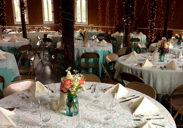Snipes Farm, once a thriving dairy farm in Orange County dating back from the 1940s, was the perfect venue for their party. Mary chose a soft sea foam color for the dining table linens and the collection of vintage lace overlays from Southern Vintage Table created the delicate, vintage look. With floral help from friends Florence and Ennis, table centerpieces were artfully arranged in vintage blue and clear Mason jars with an assortment of roses, Mary’s favorite, and other colorful flowers. The end result was simply gorgeous!
