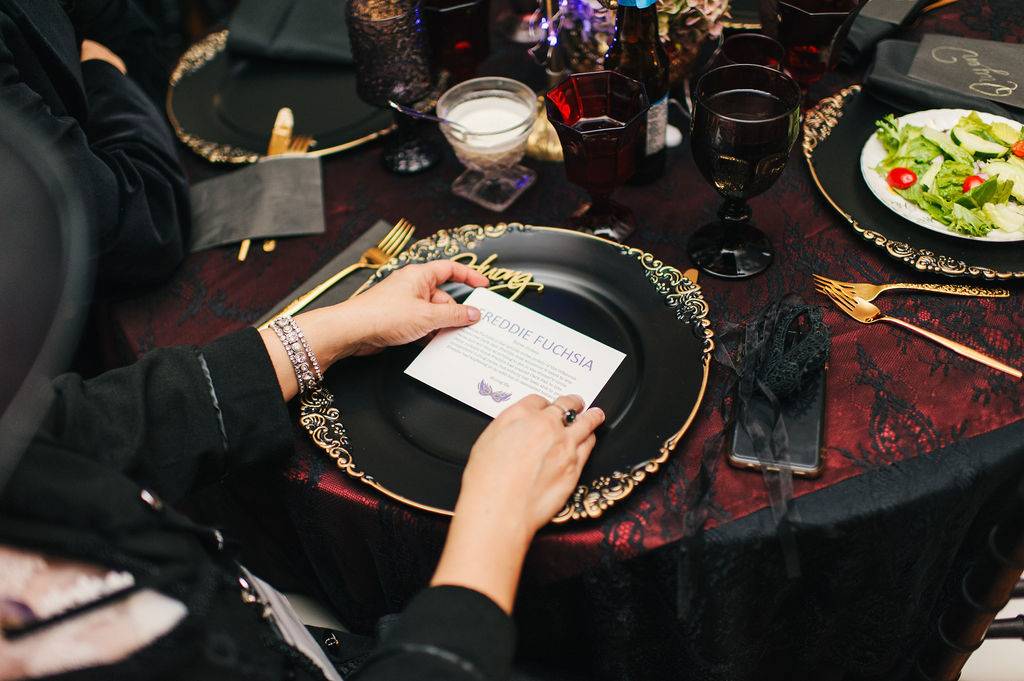 Ian and Cathy provided most of the decor but they needed just a few things to round out this spectacularly spooky evening. We were so pleased to have vintage red and purple goblets, brass candelabras, and gold flatware to add the finishing touches to this hauntingly, happy wedding day!