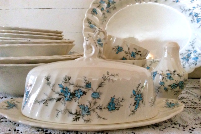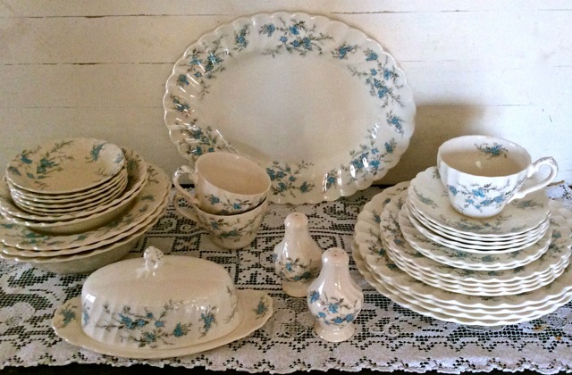My favorite addition, however, is a gorgeous set of vintage china called Forget Me Not by Myott china. This set is perfect – cream colored with a swirl rim and sweet blue flowers. I love the pattern but mostly I love how they came to Elma’s shop. Scott and Elma bought them at an auction for me. Such an act of kindness! Look for an upcoming “mixing & matching” blog with this beautiful pattern.