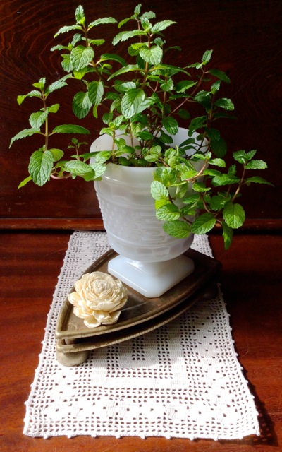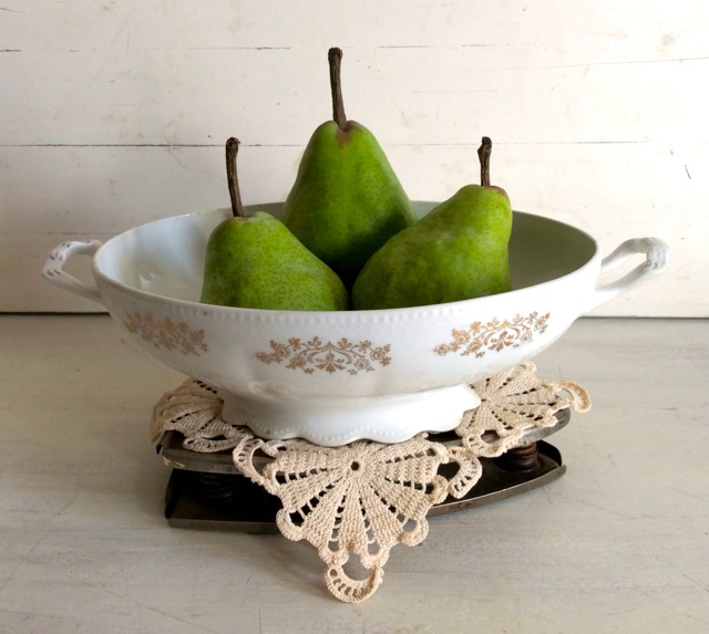 The following week I returned and when Elma saw me, she smiled. “Well, I haven’t had a chance to do much back there but I’ll make a path for you.” More than a few things were moved out of the way and then she left me to look. I started making a pile of a few things – a wooden box, milk glass goblets, vintage books – and as I am surveying the room filled with stacks, boxes and bags of “stuff” as Elma calls it, my plan came to me. I walked back into the front. “Elma, I said, “you need help getting that room organized and I would like to offer my services.” I suggested a bartering deal – my organizing skills for vintage things. She loved the idea and so did I!