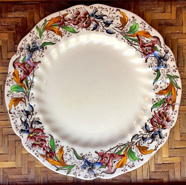 The third English pattern is Tintern by Royal Doulton. Manufactured from 1935-1960, this creamy pattern is colorful and dramatic. I was thrilled to find two of these! According to Wikipedia, Tintern, a historic village in Wales, is known for its natural beauty and the ancient 12th century Tintern Abbey. Interestingly, Tintern and another historic village, Chapel Hill, have merged to form a larger province. Perhaps a cosmic message for me to visit, huh?
