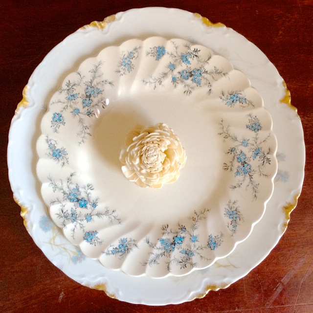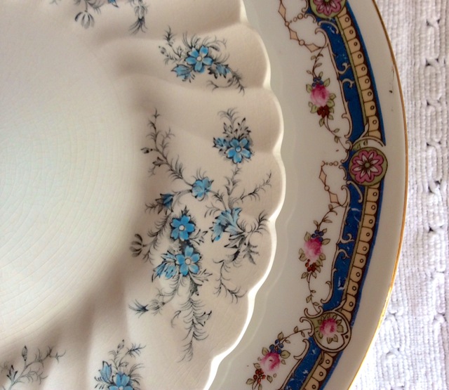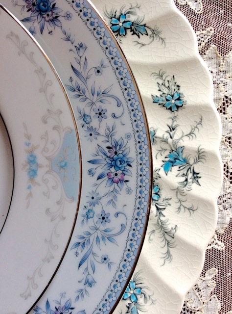 The two gorgeous teacups pictured above were one of my first finds. Not exactly salad plates, but they definitely caught my eye! There’s no mark on the bottom and they didn’t have saucers but I found some on our shelf that look perfect. Aren’t they beautiful? Update! Mary Jane Pearson Baker of Springbranch Landscapes just told me these are “Forget-Me-Not” flowers. I should have picked up on that since I wrote a blog post on a china pattern featuring this lovely, blue flower. I’ll not forget this next time!